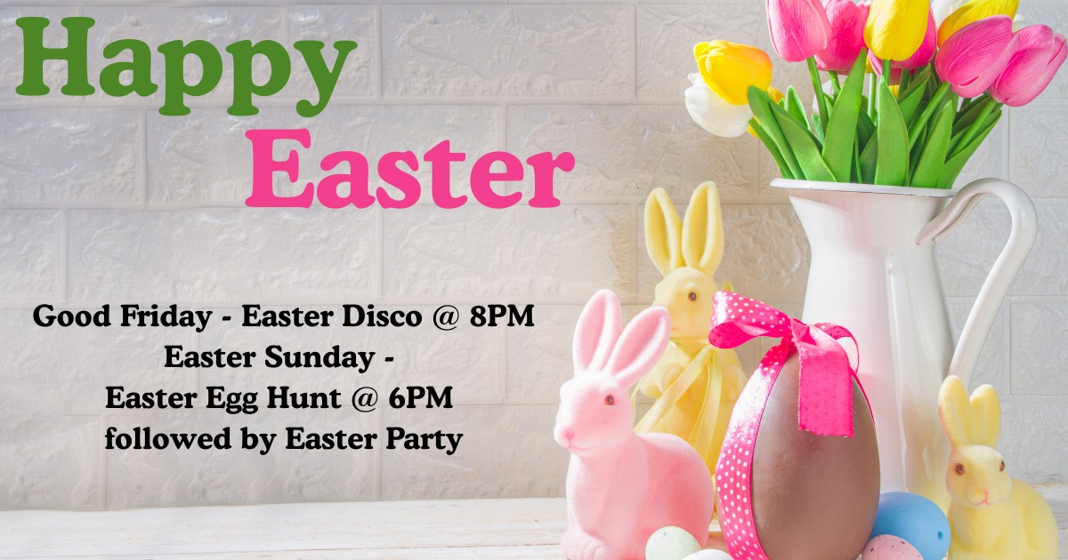 Easter egg hunt 4pm Callum Kewen 5.30pm Disco Karaoke 7pm